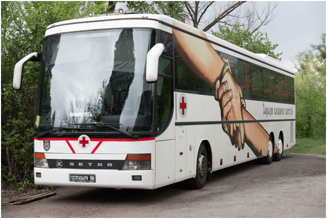 Количество выездов на «Австрийке» зависит от вызовов. Если стабилизационные пункты переполнены, приходится ехать срочно, это связано с тем, где и какие велись бои. Усложняет ситуацию, что, в основном, развозить раненых приходится по разным больницам, иногда до 6-8 заведений за одну поездку. А двигаться выпадает и в час пик, когда большие пробки, и печальнее всего, по словам команды “Австрийки”, что их автобус не спешат пропускать водители. Поэтому нередко поездка превращается в квест, опасный для жизни тяжелораненых. Хорошо, когда есть машина сопровождения, которая едет с мигалками и требует, чтобы срочно пропустили.