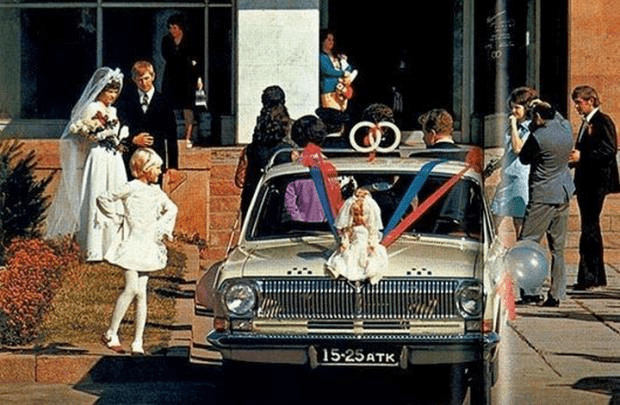 - Черный автомобиль. Ранее на Днепропетровщине чаще всего арендовали черную «волгу», которую украшали лентами, кольцами, а спереди сажали куклу. Там катали супругов, а за ними ехали гости. Это считалось когда-то элементом изобилия.