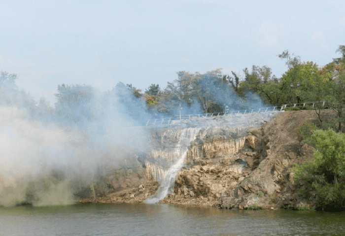 Водоспад відкрили у 2013 році, а розташувався він зліва від Монастирського острову. Оглядовий майданчик цього місця вважають найромантичнішим і тут точно дівчина не відмовить у пропозиції руки та серця. Тут відкривається краєвид найдовшої набережної Європи та відчувається прохолода в спекотні літні дні. Чудове місце, щоб освідчитись, розказати про свої почуття, помилуватися красою природи разом з коханою людиною. Такий варіант буде абсолютно безкоштовним.